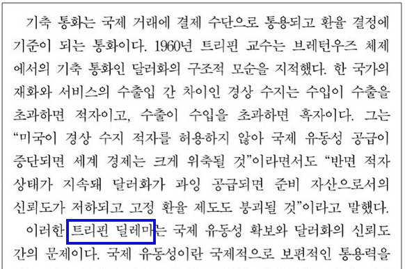 - 벨기에 경제학자 로버트 트리핀이 제시한 국제통화체제의 구조적 모순